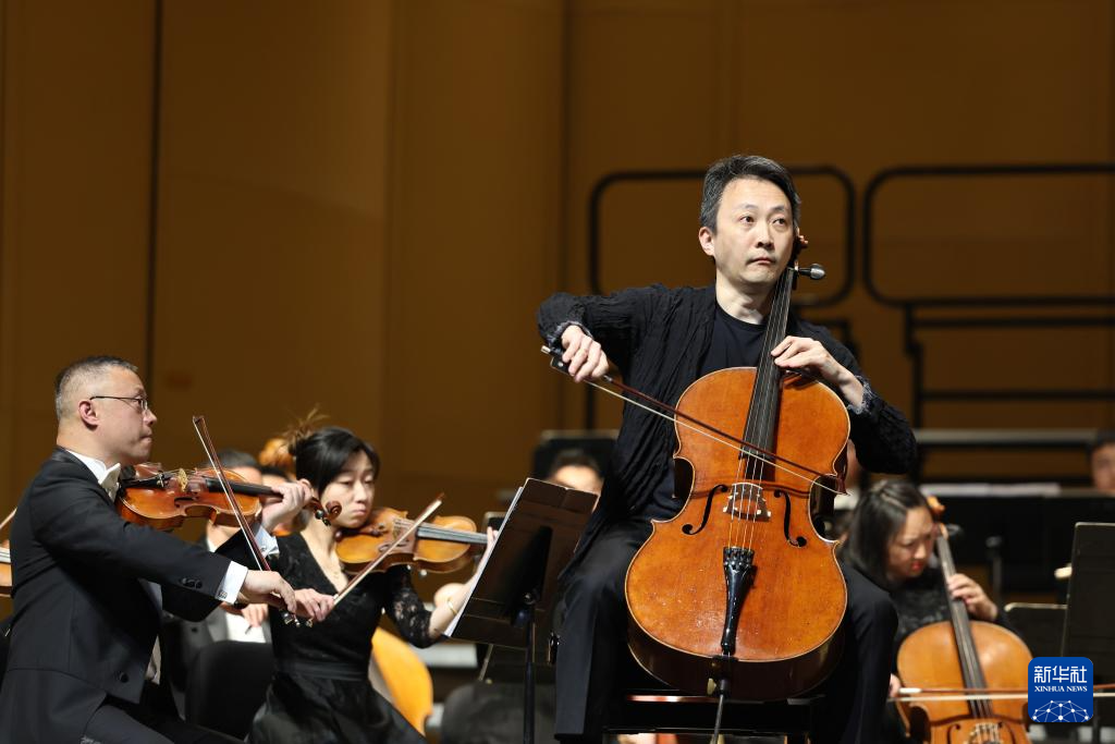 3月20日,大提琴演奏家朱牧(前)在黄河·兰州2026音乐季的开幕音乐会上表演。