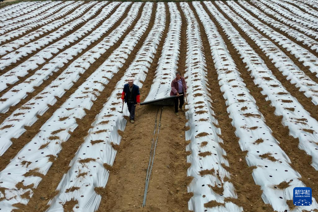 3月25日,贵州省毕节市赫章县兴发苗族彝族回族乡农民在田间进行覆膜作业(无人机照片)。