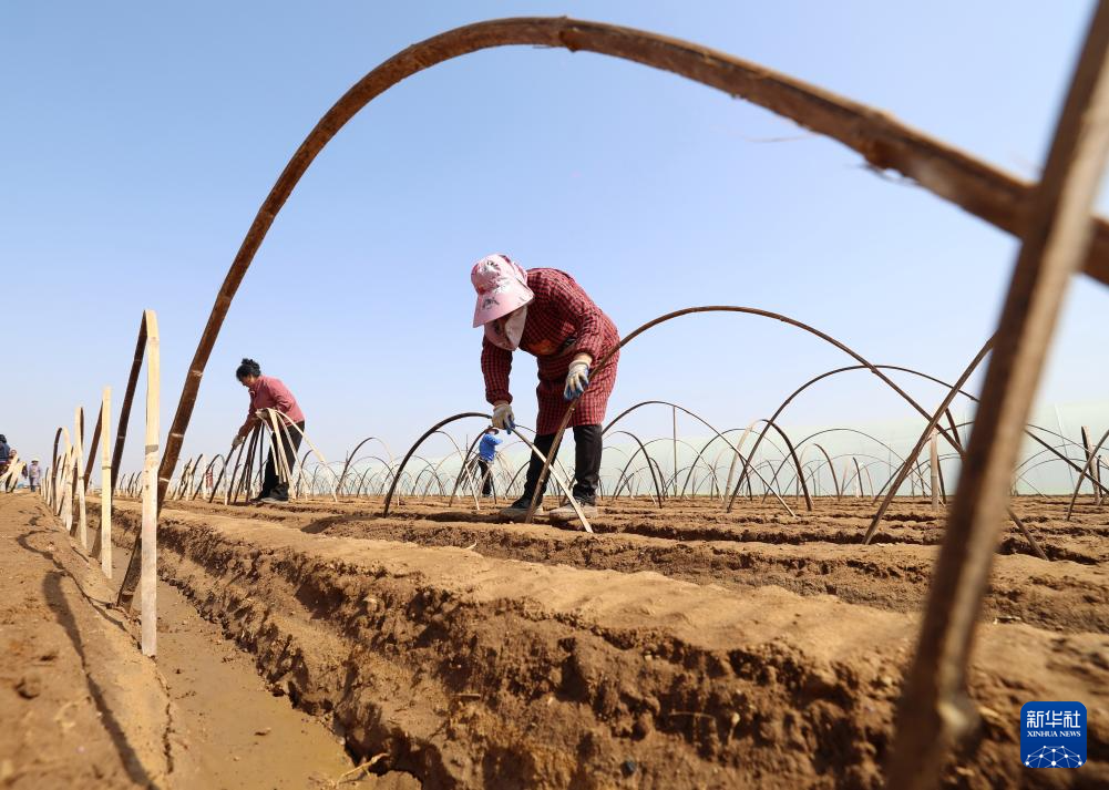 3月25日,河北省石家庄市行唐县南桥镇农民在田间搭建姜棚。