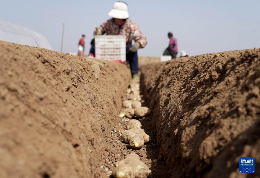 3月25日,河北省石家庄市行唐县南桥镇农民在田间种植生姜。