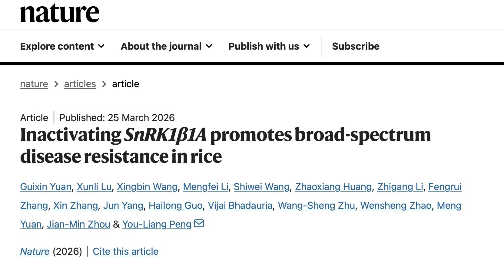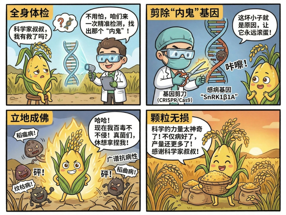 水稻,养活了全球一半人口,也是我国的主粮之一。但水稻的一生常常会遭到稻瘟病、纹枯病、稻曲病、胡麻叶斑病等多种真菌病害的“联合攻击”。为了找到能同时抵抗这些“绝症”的广谱抗病良方,中国农业大学植保学院彭友良团队通过敲除SnRK1β1A基因,让水稻获得广谱抗病的防御能力,并于3月26日在国际学术期刊《自然》(Nature)上发表了题为 “Inactivating SnRK1β1A promotes broad-spectrum disease resistance in rice”的研究论文。