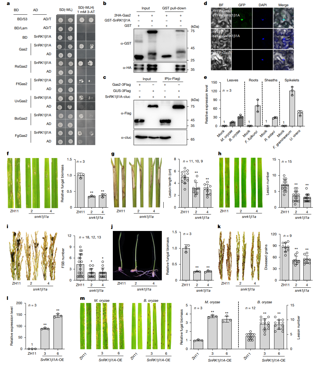 该团队进一步解析了水稻的SnRK1β1A蛋白的分子功能,发现SnRK1β1A是一个病菌侵染可诱导性蛋白,对SnRK1催化亚基SnRK1α1起负调控作用,通过抑制SnRK1α1的激酶活性和核定位及其介导的基础抗性,促进水稻的感病性。尤其是,通过基因敲除和过表达证明SnRK1β1A是一个感病基因,其敲除体在室内和田间对稻瘟病、纹枯病、稻曲病、胡麻叶斑病、恶苗病以及穗腐病等呈现广谱抗病性,在正常栽培条件下具有野生型水稻相似的农艺性状,并显著减少稻瘟病等引起的产量损失。