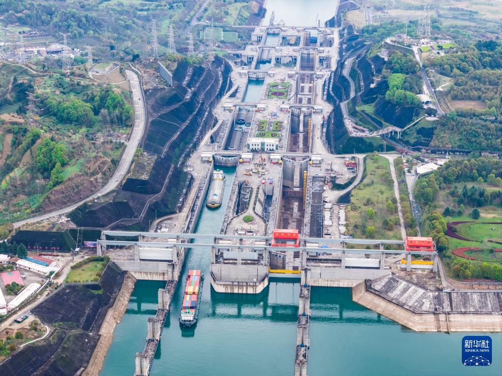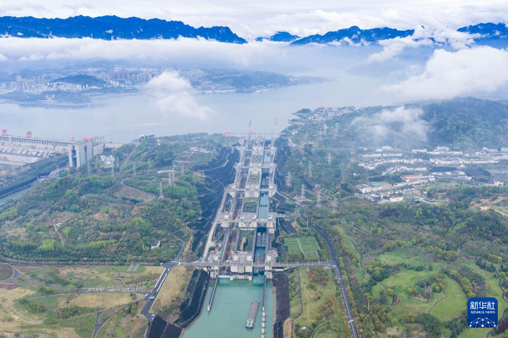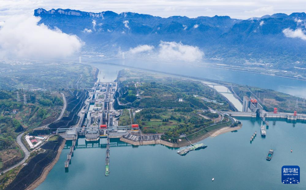 3月30日,湖北宜昌,三峡枢纽南线船闸正加紧检修,北线船闸和升船机有序通航(无人机照片)。