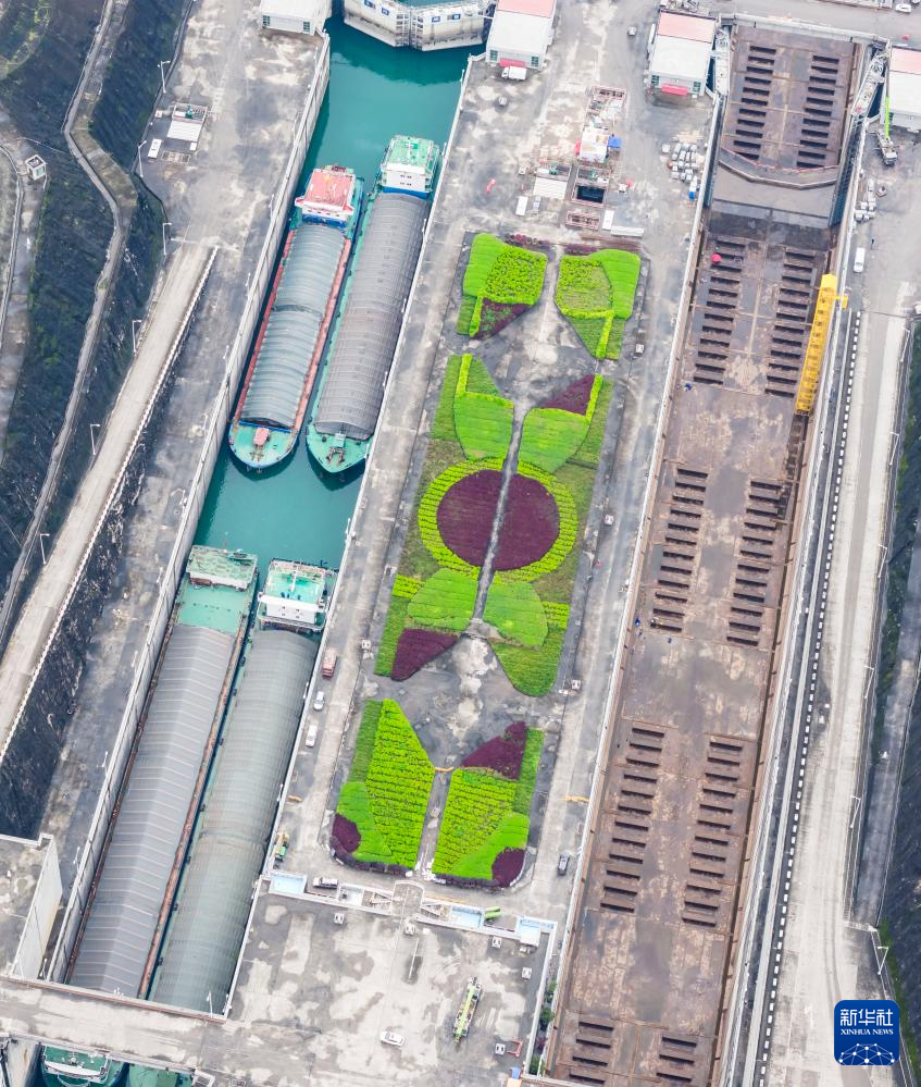 3月30日,湖北宜昌,三峡枢纽南线船闸正加紧检修,北线船闸有序通航(无人机照片)。