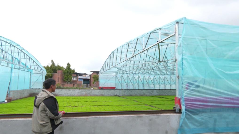 在泸县方洞镇三界村的优质稻育秧中心,秧苗在恒温恒湿的环境中生长,暗化催苗室、水肥一体化系统和自动化育秧生产线等技术的应用,使水稻育秧周期从三四十天缩短至十五天左右。
