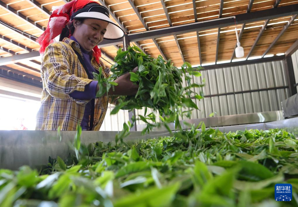 3月28日,云南省勐海县勐混镇贺开村茶农摊开晾干茶叶鲜叶。