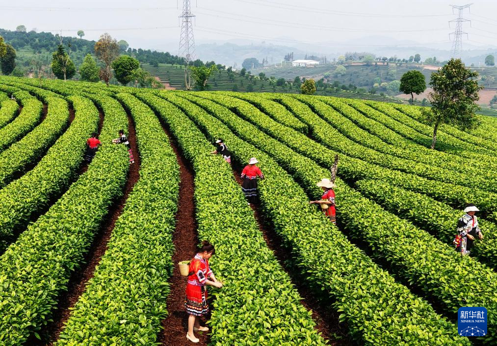 3月27日,在云南省南涧彝族自治县碧溪乡凤凰山,茶农在茶园里采摘春茶(无人机照片)。