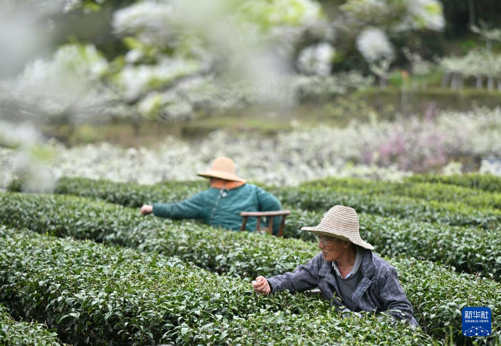 3月27日,湖北省宣恩县椒园镇黄坪村农民在梨茶套种的田间采摘明前茶。