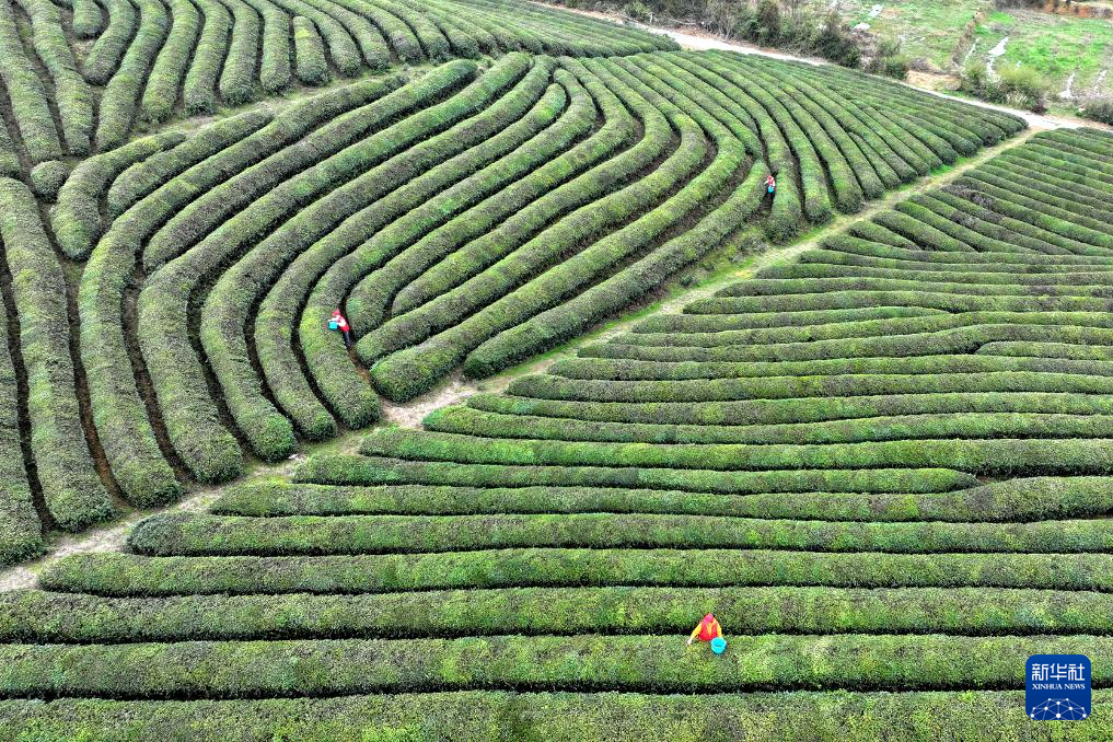 3月27日,茶农在湖北省咸宁市通城县隽水镇油坊村锦山基地茶场采摘明前茶(无人机照片)。