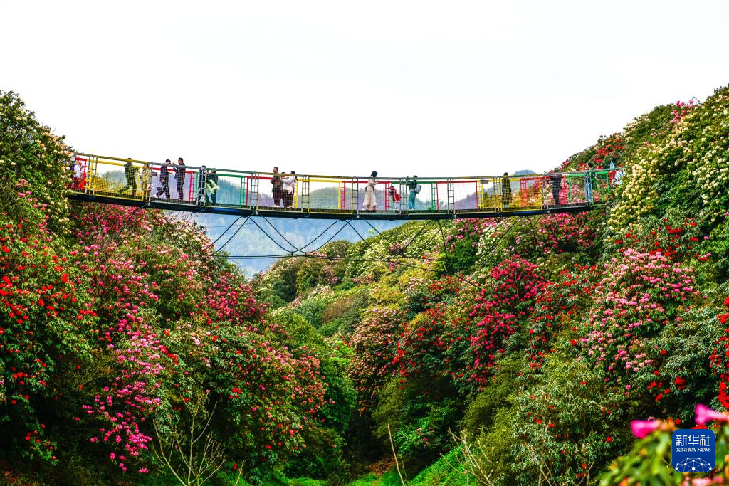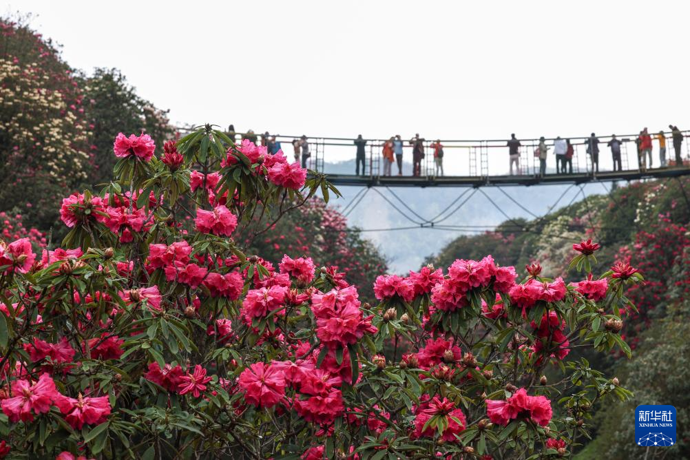 4月1日,游客在百里杜鹃管理区金坡景区一处吊桥上赏花。