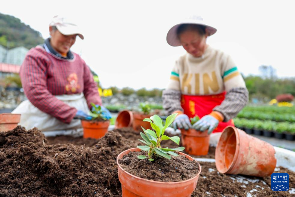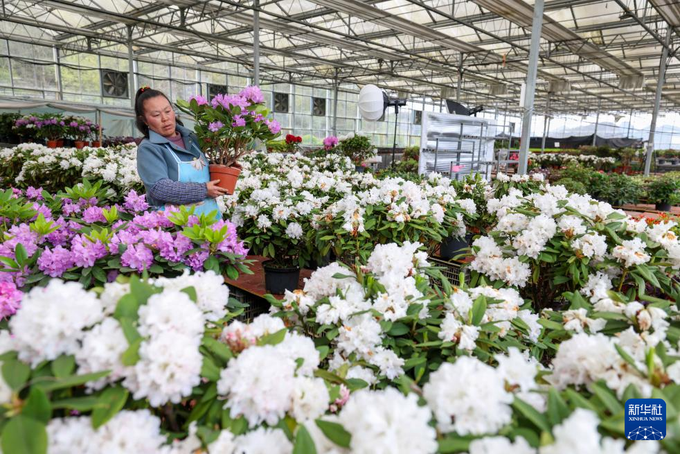 3月28日,工人在百里杜鹃管理区汇境花卉科技园管护杜鹃花苗。