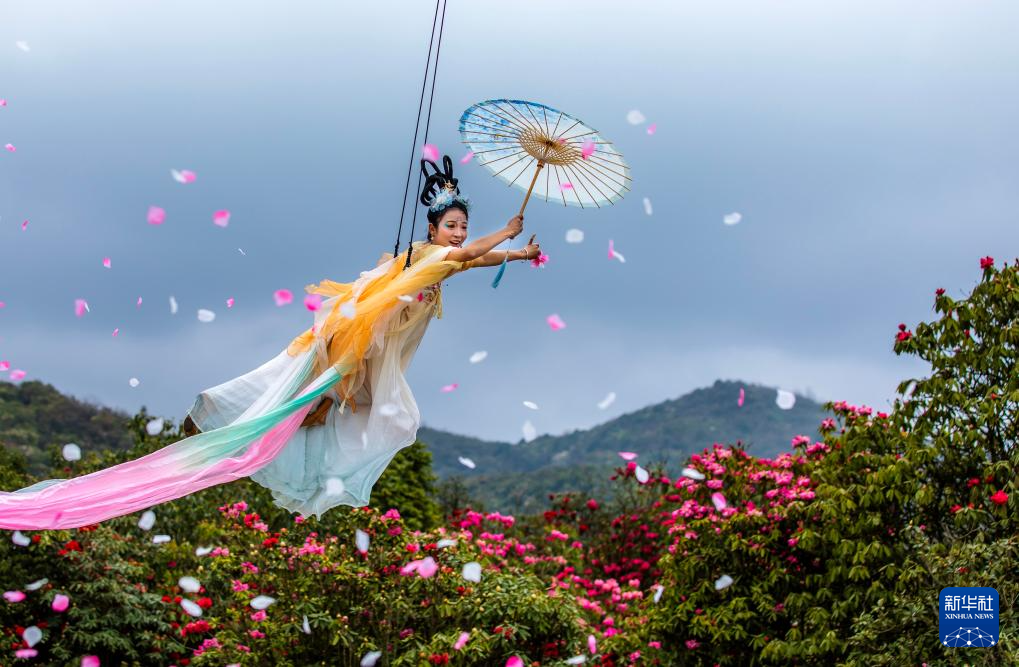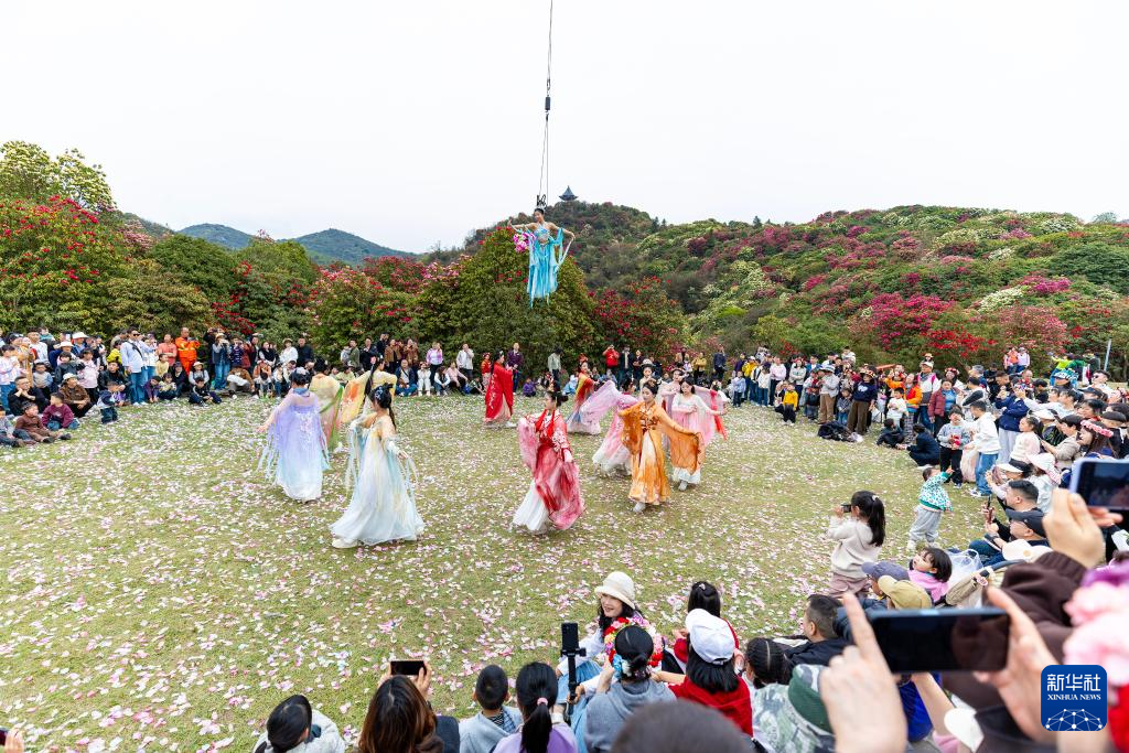 3月26日,“花仙子”在百里杜鹃管理区普底景区为游客表演“天女散花”。