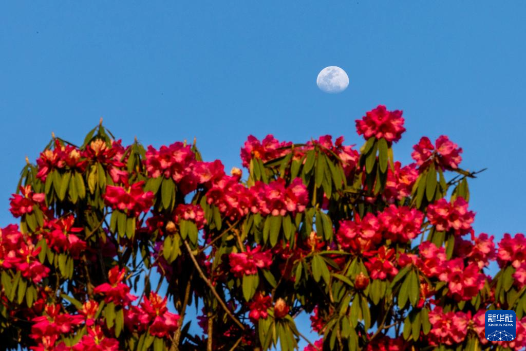 3月29日在百里杜鹃管理区普底景区拍摄的杜鹃花和月亮。
