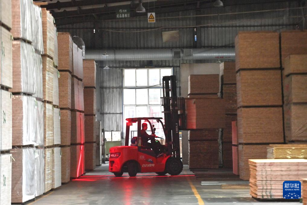 在柳州市融安县一家香杉板材生产企业,工人驾驶叉车搬运板材(4月1日摄)。