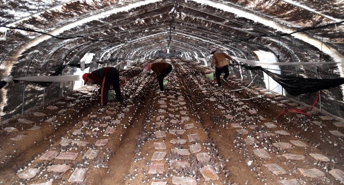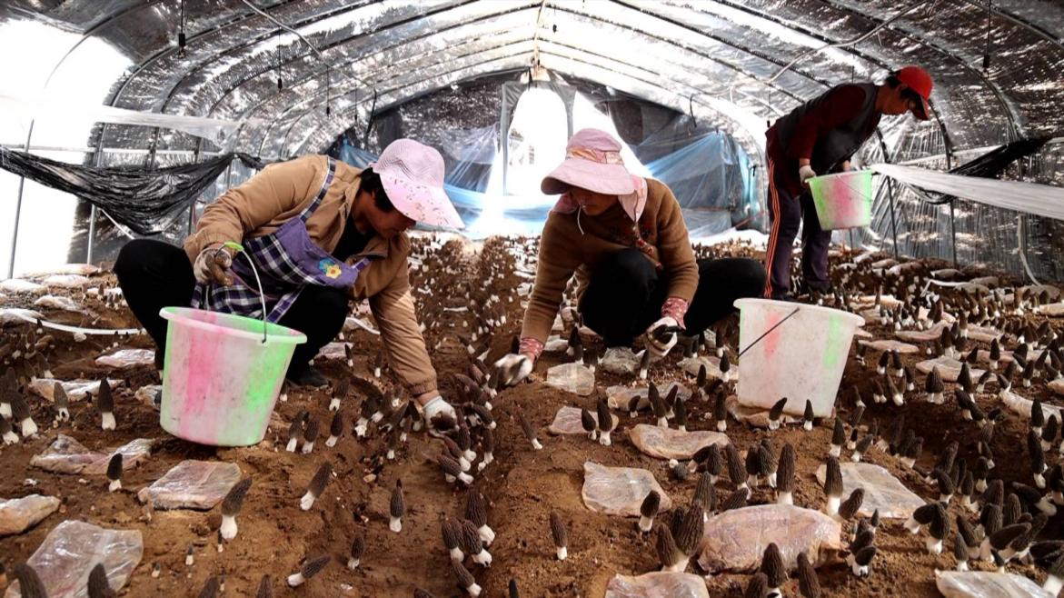 山东省济宁市邹城市香城镇羊肚菌种植基地内,一朵朵呈灰褐色的羊肚菌破土而出,生长态势颇为喜人,村民正忙于采摘鲜菌。