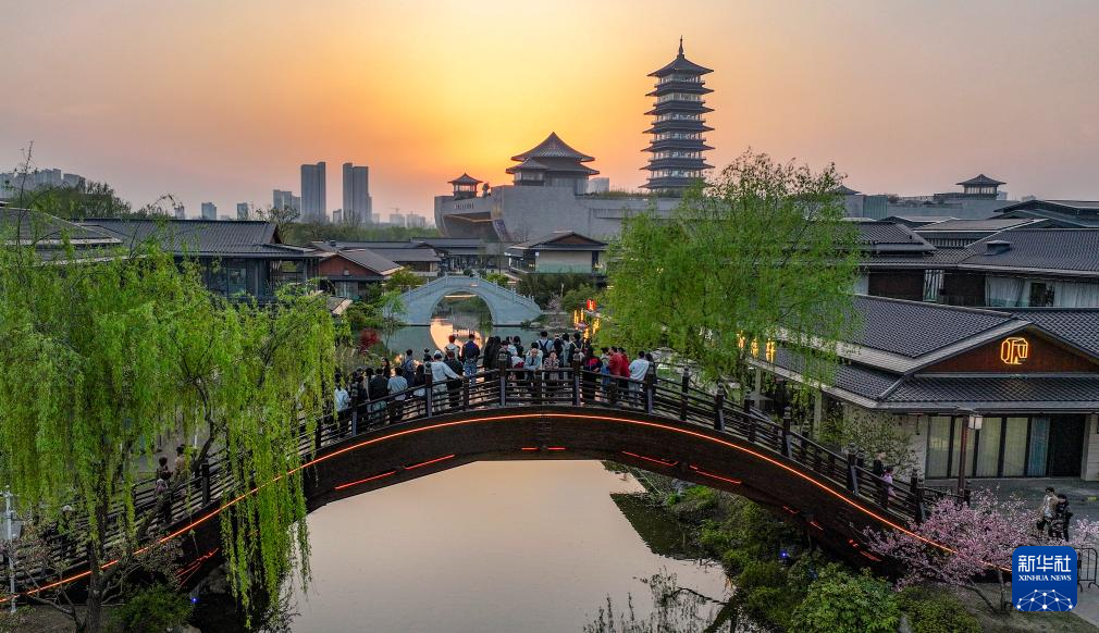 4月4日,游客在江苏扬州运河三湾风景区欣赏落日(无人机照片)。