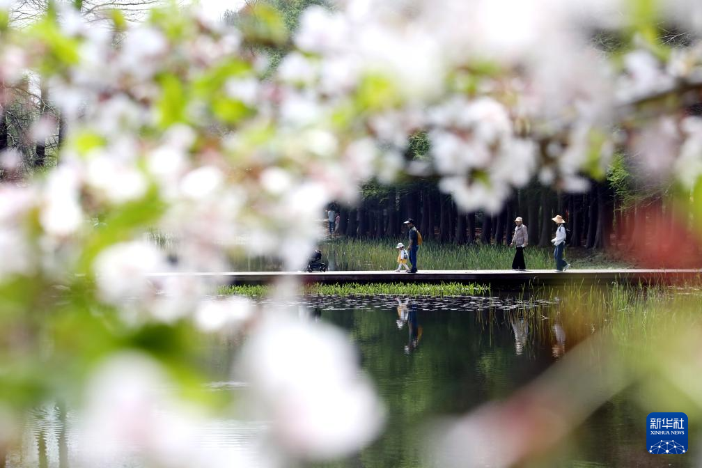 4月4日,游人在山东省滕州市荆河公园赏花游玩。