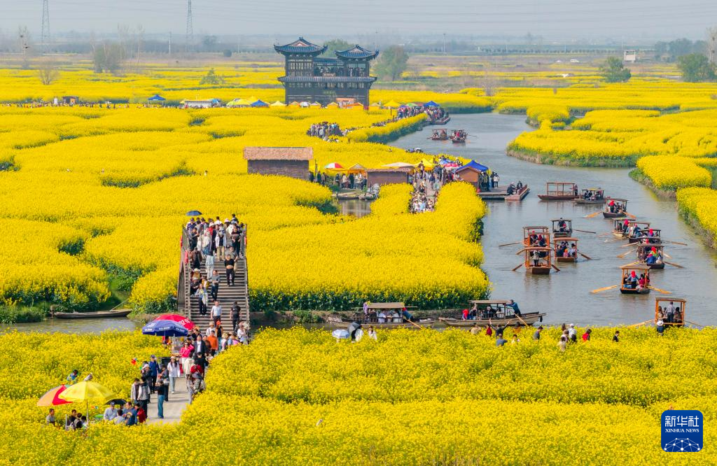 4月4日,游客在江苏省兴化市千垛景区赏花游玩(无人机照片)。