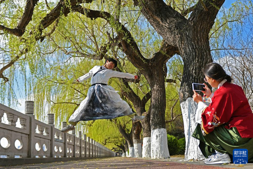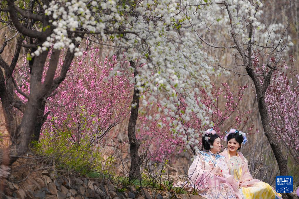 3月31日,身着传统服饰的游客在山东省邹平市临池镇赏花游玩。