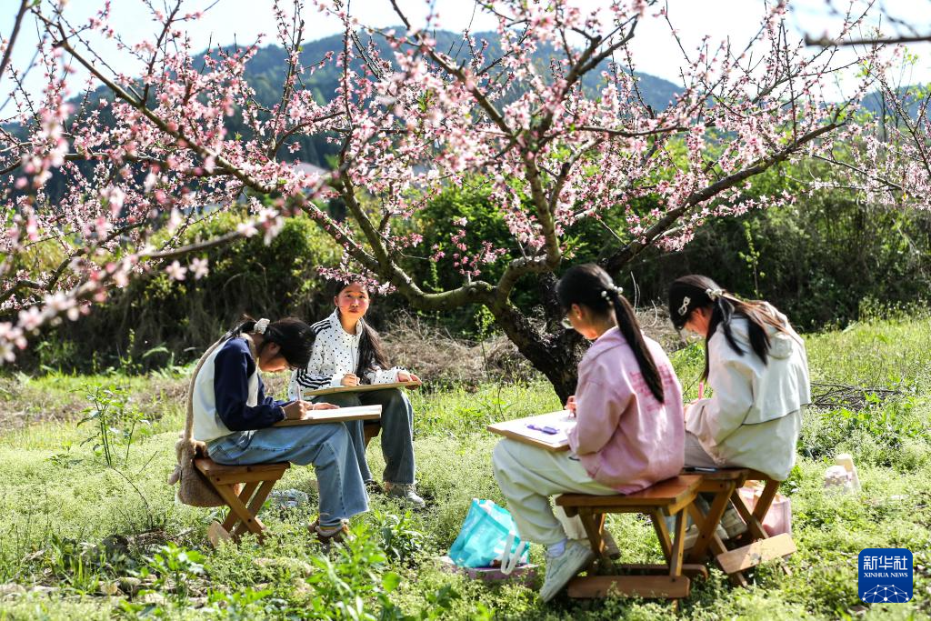 4月3日,学生在江西省抚州市广昌县头陂镇一处桃花园里写生。