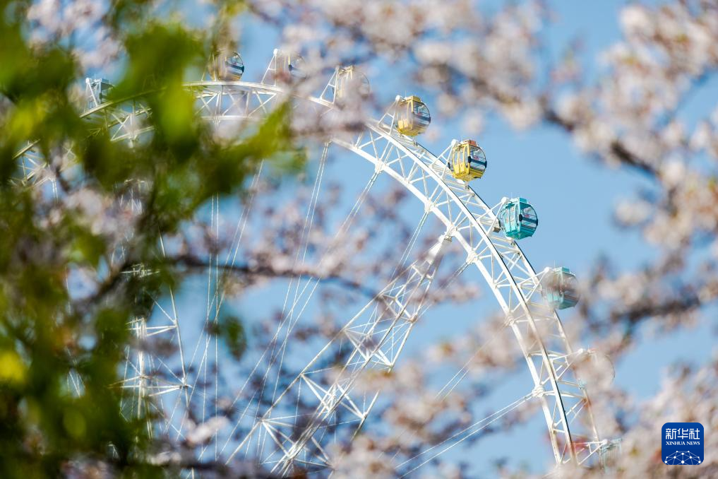 4月2日,在浙江省湖州市吴兴区,花朵与摩天轮相映成景。