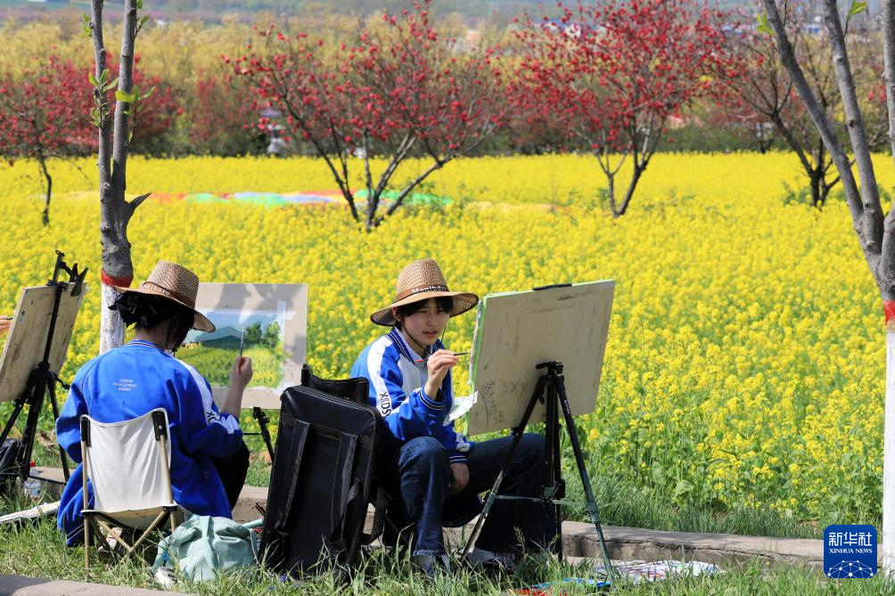4月3日,河南省许昌市襄城县第三高级中学的学生在湛北镇首山千亩油菜花田间写生。