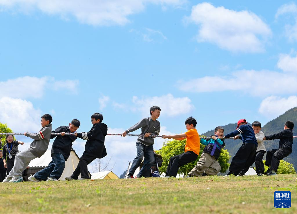 4月3日,在重庆市酉阳土家族苗族自治县叠石花谷景区,孩子们参加趣味拔河活动。