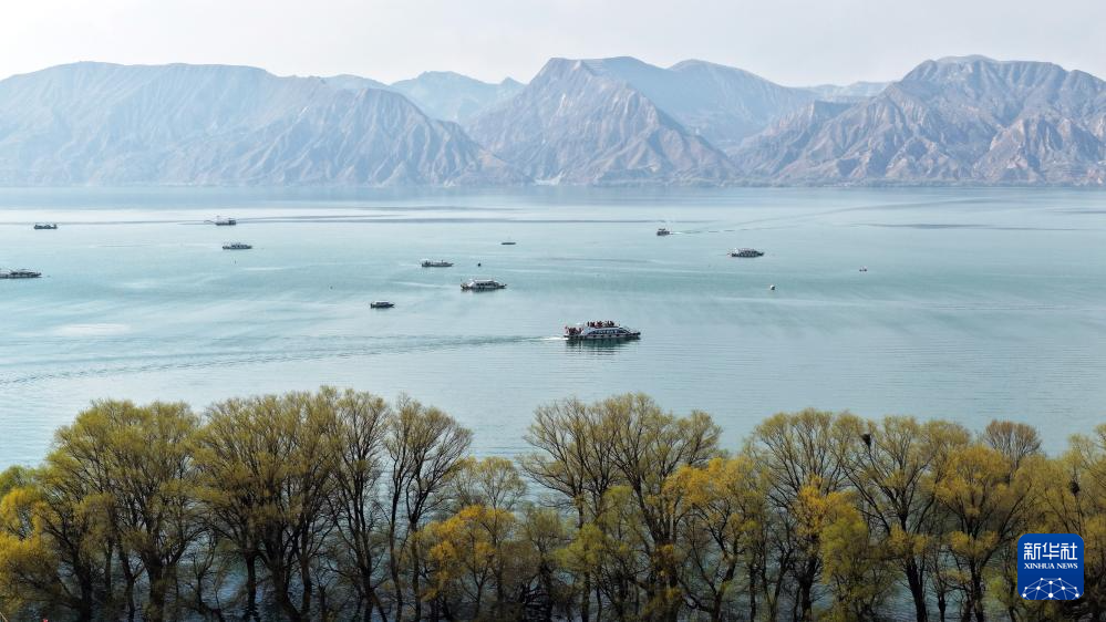 4月2日,游客在甘肃省刘家峡水库乘船游玩(无人机照片)。