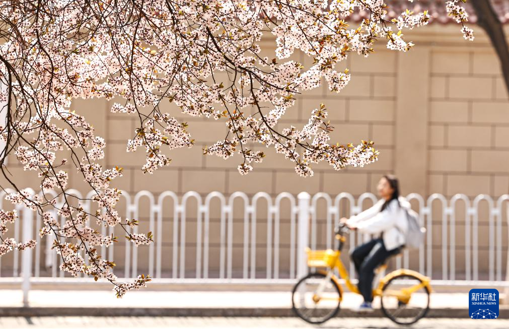 4月2日,一名女子在甘肃省兰州市城关区读者大道骑车出行,路边的紫叶李花开正盛。