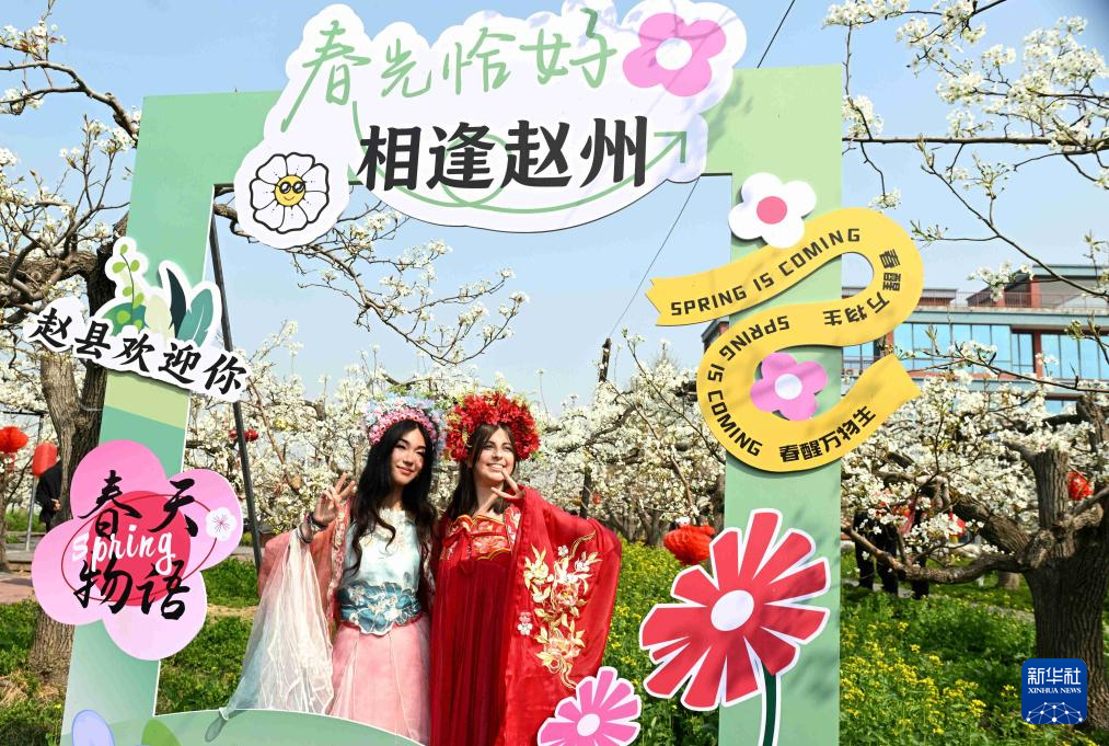 4月2日,外籍游客在河北省石家庄市赵县谢庄镇梨园游玩拍照。