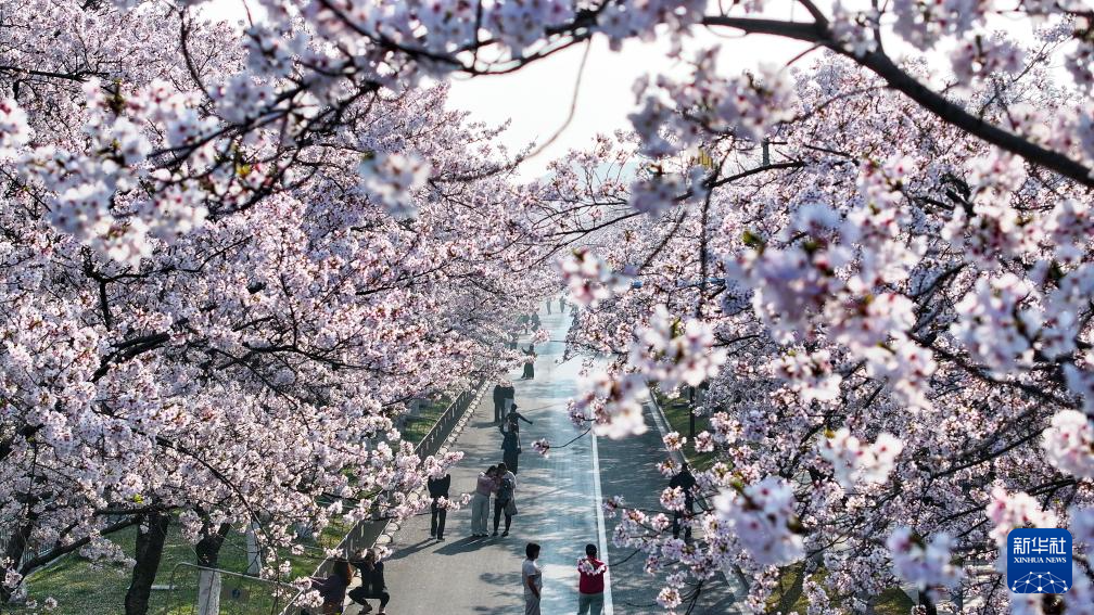 4月2日,人们在江苏省扬州市鉴真路“樱花大道”上赏花游玩(无人机照片)。