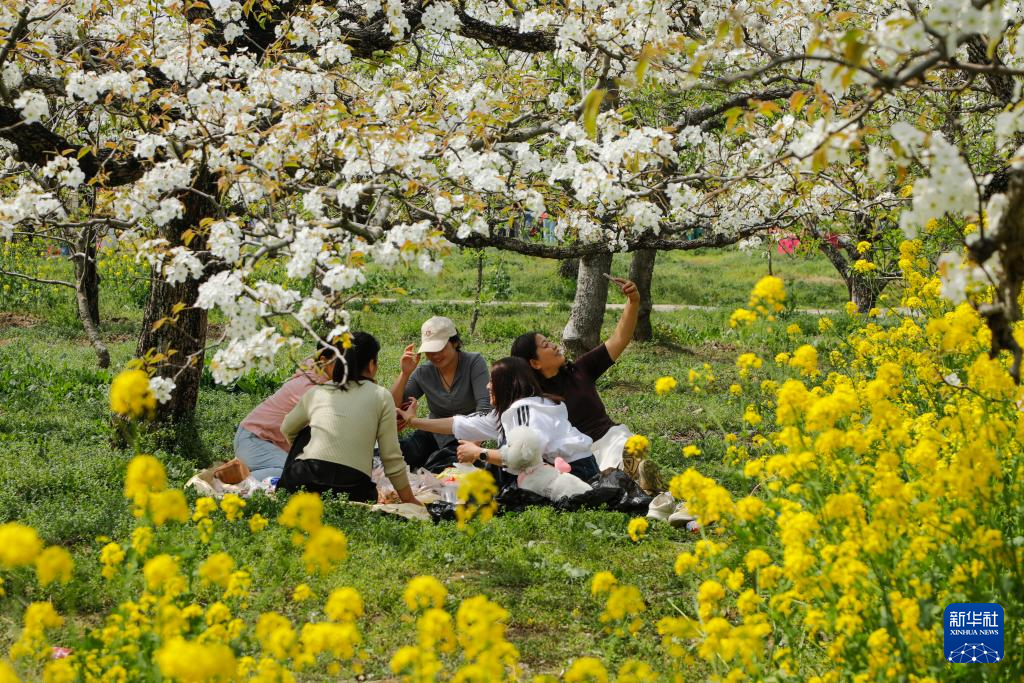 4月2日,人们在江苏省徐州市丰县宋楼镇李大楼村百年梨园内野餐休闲。