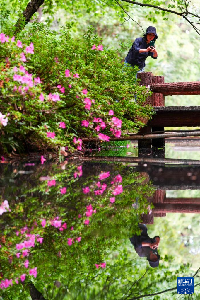 3月31日,一名女子在云南省昆明市黑龙潭公园拍摄盛开的杜鹃花。