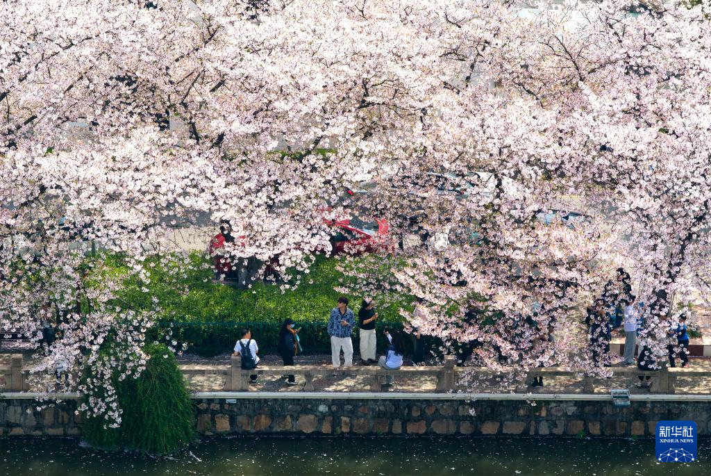 4月5日,人们在江苏省常熟市的护城河畔赏花(无人机照片)。