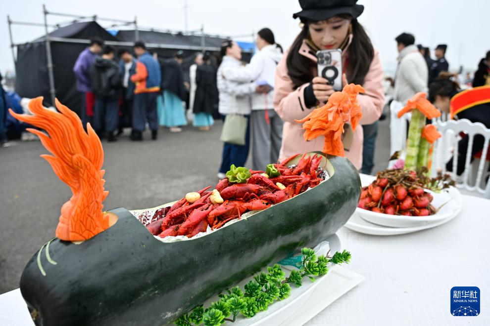 4月3日,一名女士在龙虾开捕仪式活动现场拍摄小龙虾菜品。