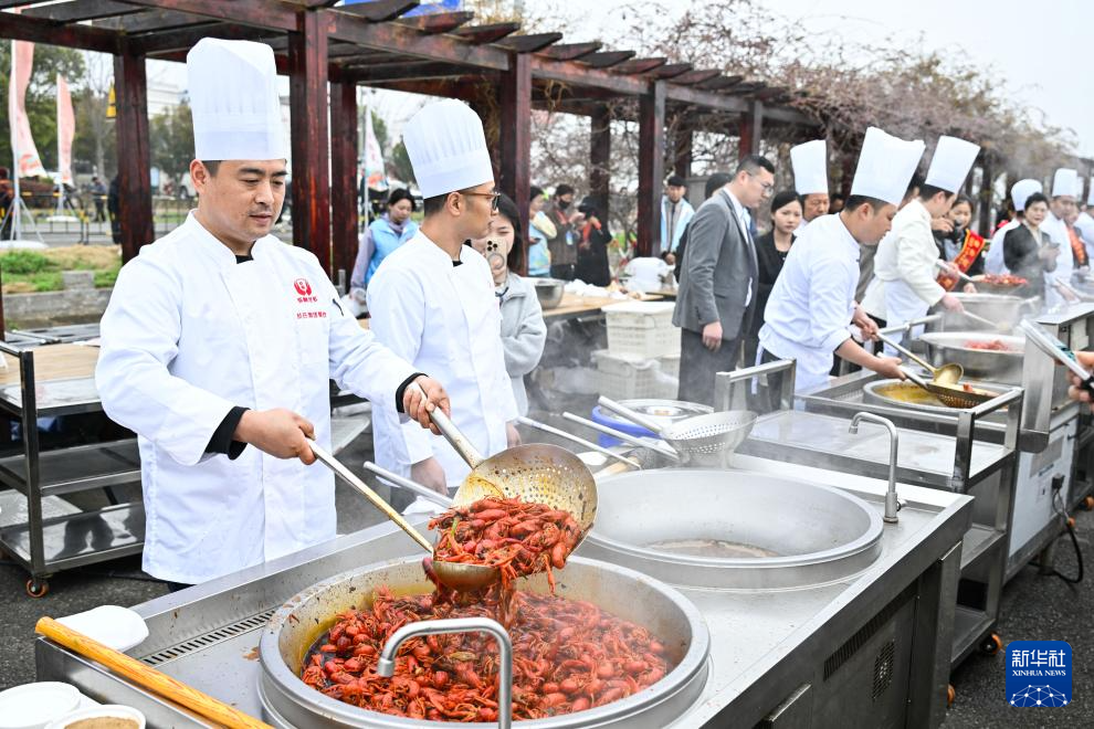 4月3日,厨师在龙虾开捕仪式活动现场烧制小龙虾。