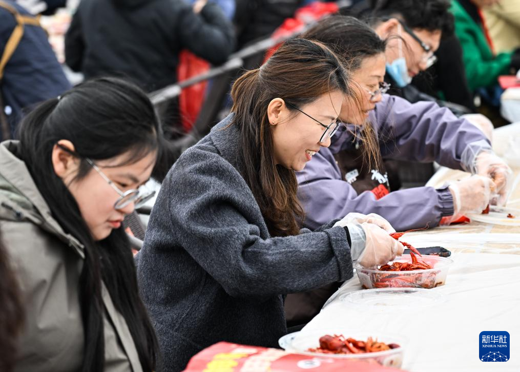 4月3日,人们在小龙虾开捕仪式活动现场品尝小龙虾。