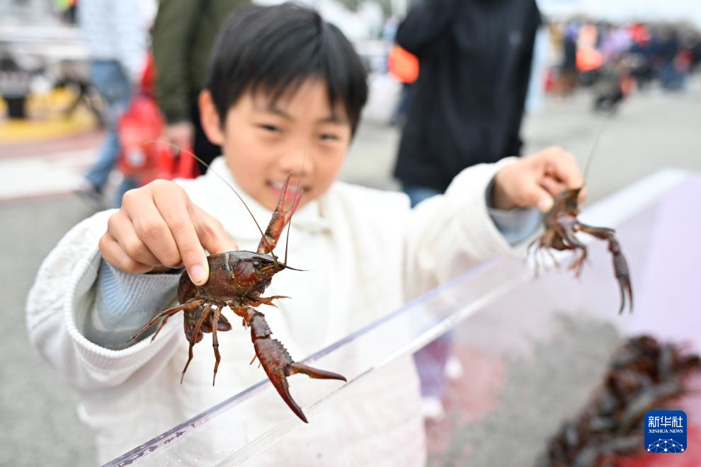 4月3日,小朋友在龙虾开捕仪式活动现场展示头网小龙虾。