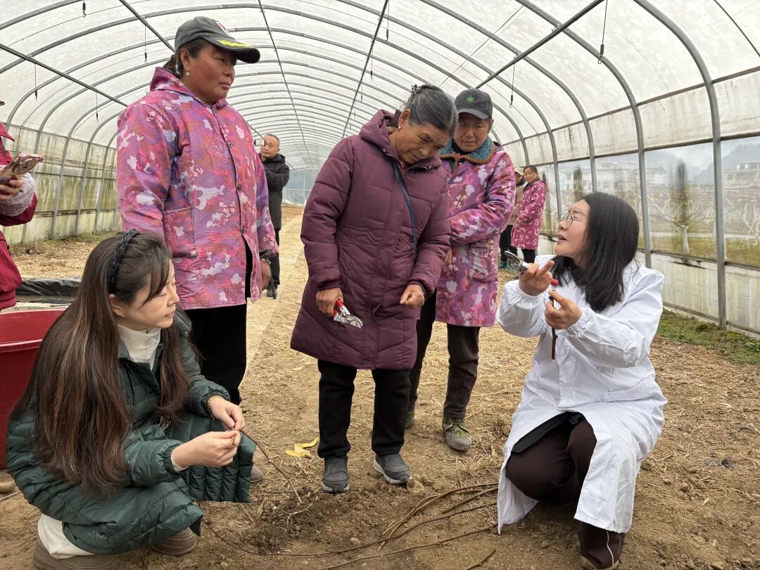 走进湖南省湘西州永顺县高坪乡场坪村,中国农科院“猕猴桃资源与育种”创新团队首席科学家齐秀娟研究员,正拿着一把修枝剪,手把手指导果农修剪枝条、开展硬枝扦插育苗。“上面平剪,下面斜剪,接触土壤面积大,生根才快!”她一边示范,一边讲解关键技术,帮助果农识别一年生枝、结果母枝,培育耐涝砧木苗。