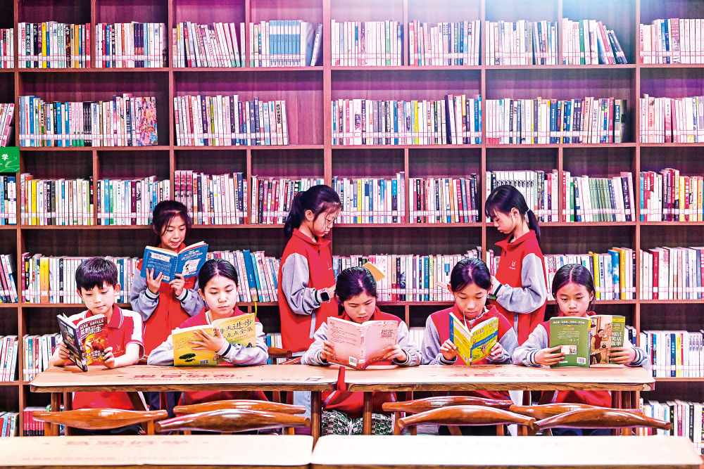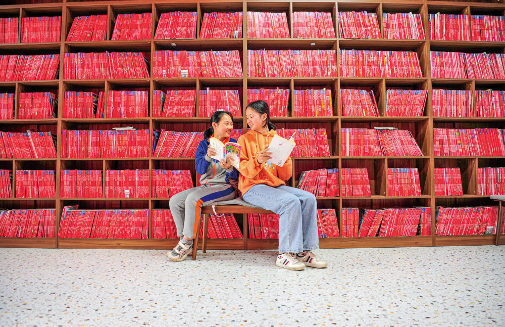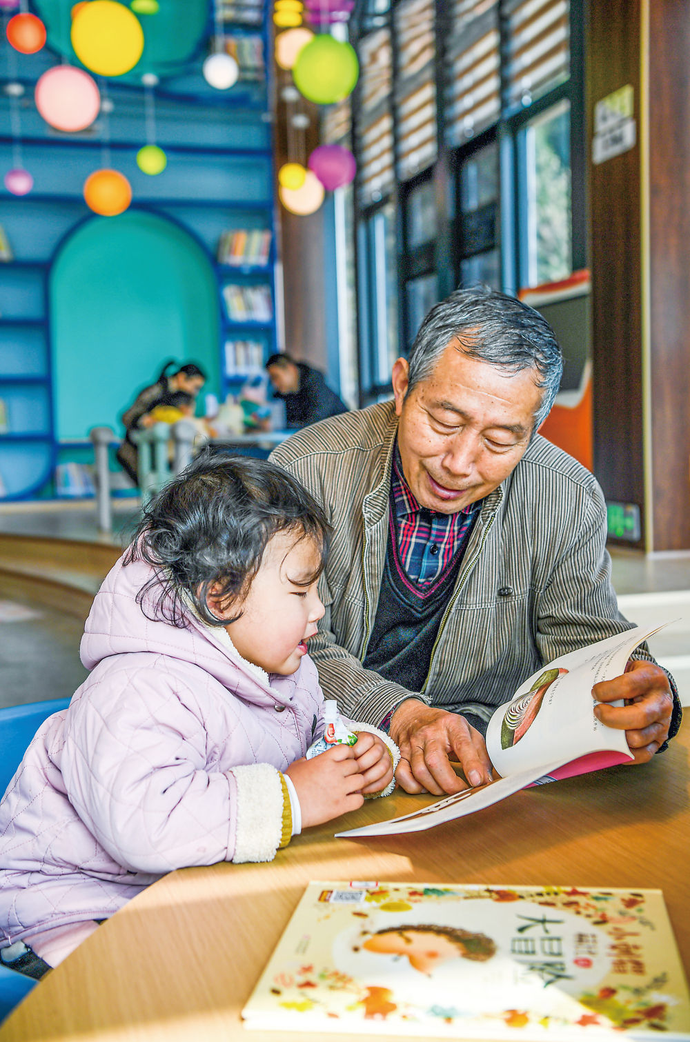 一名家长带着孩子在宜春市袁州区珠泉街道狮子山公园城市书房内阅读。新华社发(周亮摄)