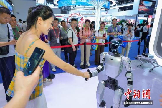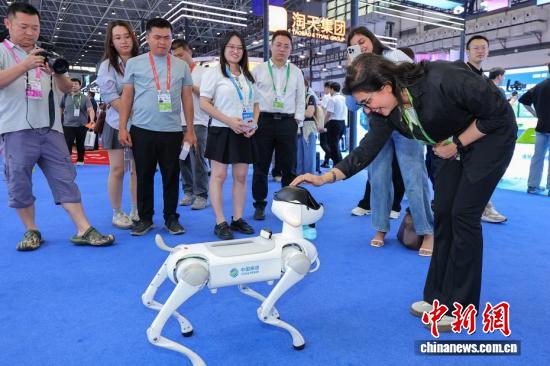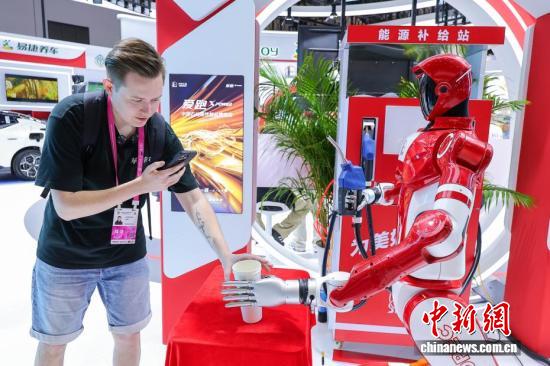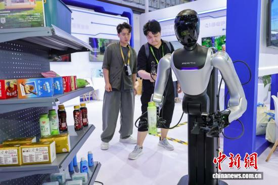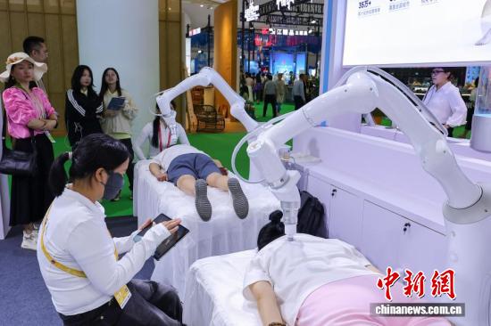 4月13日,第六届中国国际消费品博览会在海南海口启幕。多款智能机器人集中亮相展会现场,凭借前沿科技与创新应用吸引不少参观者驻足观看、互动体验。图为一台机器人在用毛笔写“福”字。