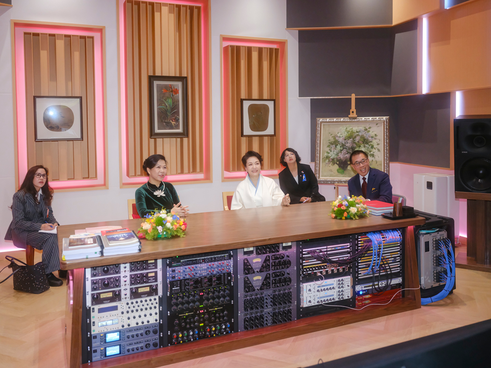 彭丽媛和吴芳璃一同参观歌剧院、虚拟现实创作空间和录音工作室,了解大剧院在支持艺术创作、提供文化服务和开展国际文化交流等方面所做的工作。其间,还观看中国民族舞剧排练和合唱团录音,不时驻足交流。