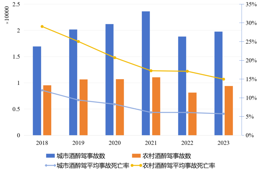 农村地区人情往来、聚饮文化浓厚,公共交通、代驾服务覆盖不足,加之巡查力度有限,助长了酒后驾车的侥幸心理。农村公路酒驾事故死亡率约20%,是城市的3倍,如图4。在涉酒亡人事故中,农村驾驶人血液酒精含量高于城市,酒后超速倾向也更明显,车速平均提升3.5-8.8 km/h。