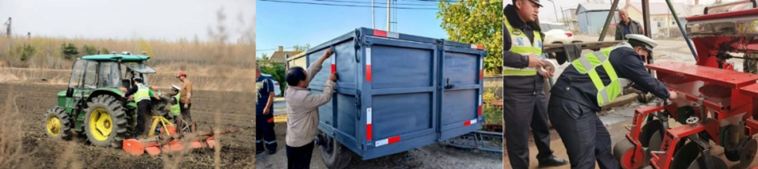 1.整地、播种——农机密集,早晚风险高。拖拉机、播种机等农业机械集中上路,与其他车流形成巨大速度差,易引发追尾事故。农民“清晨下地、黄昏收工”,光线昏暗时农机可见性问题尤为突出。同时,拖拉机常牵引耙犁、旋耕机等农具,机组整体长度大幅增加,反光标识却往往仅贴于拖拉机车身,拖挂农具缺少示警装置,后方驾驶人容易误判车长、跟车距离失准。田间耕作还易导致反光标识被泥浆覆盖。