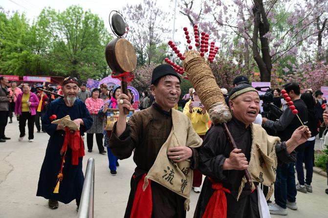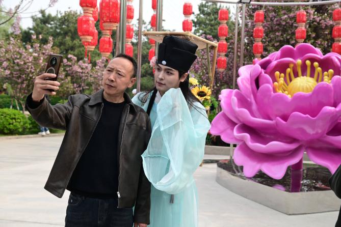 汉服文化巡游与老北京民俗文化巡演轮番登场,游客可随时合影互动。十余名身着华服的巡游演员漫步花间。老北京市井风情生动重现,游客可随时合影互动。