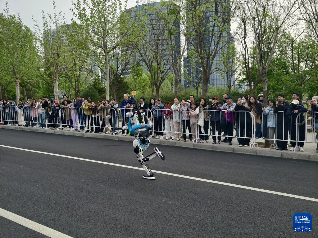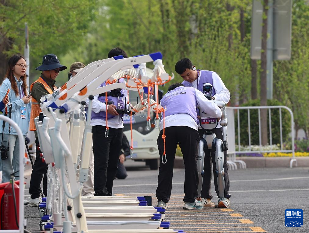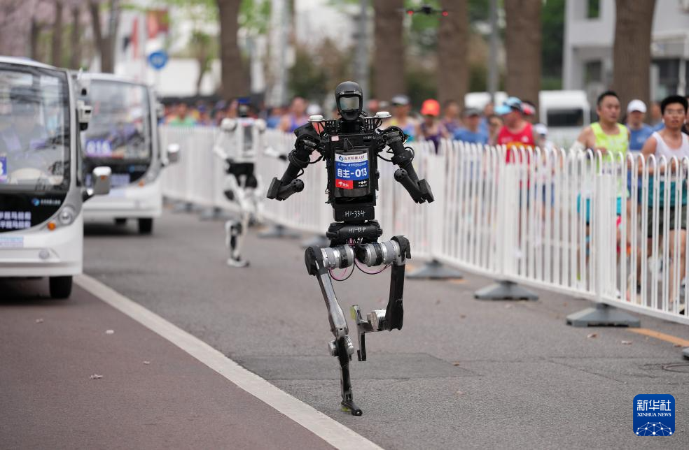 4月19日,天翼队自主人形机器人选手天工Ultra-2025(左前)在比赛中。