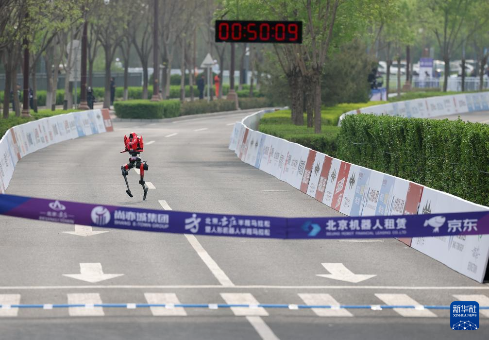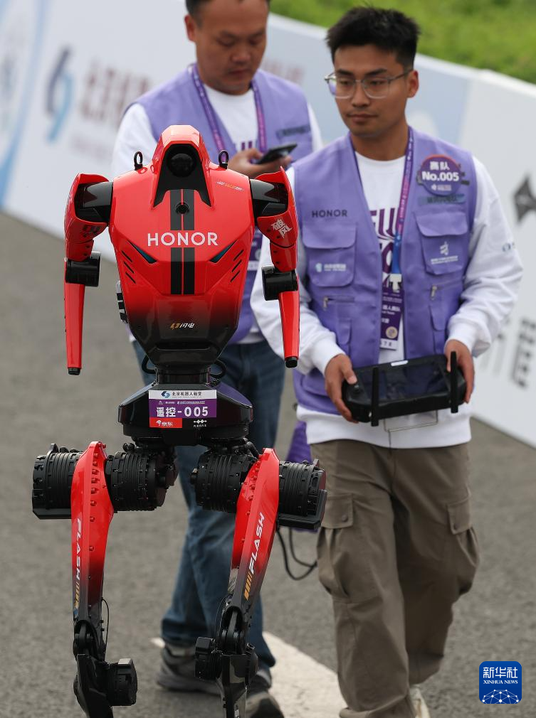 4月19日,北Y赛队自主人形机器人选手宇树H1(前)在比赛中。