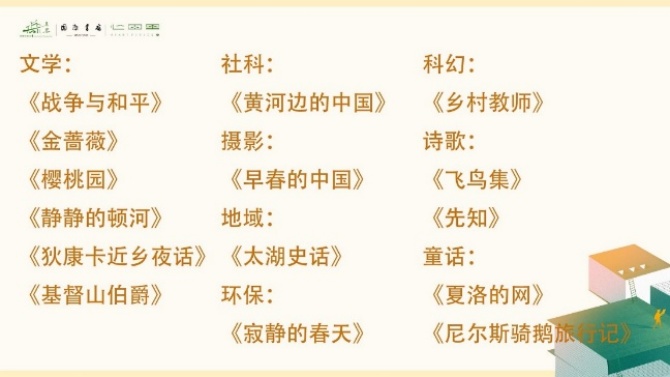 草婴读书会为乡村书友推荐了共读书单,包括文学社科、摄影、环保、童话等类别的15本图书。草婴读书会会长远方说,“好书真的读不完。推荐这些书,是结合我们读书会的共读书单,结合乡村阅读的特点,结合名著中的一些乡村叙事,希望能让乡村的读者感受到经典的魅力。”