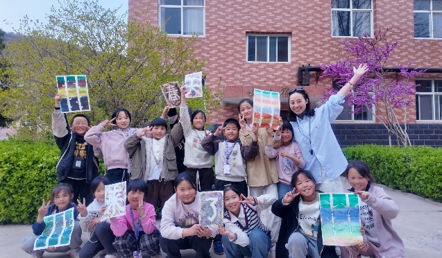 北冶小学的学生在支教老师指导下阅读、作画