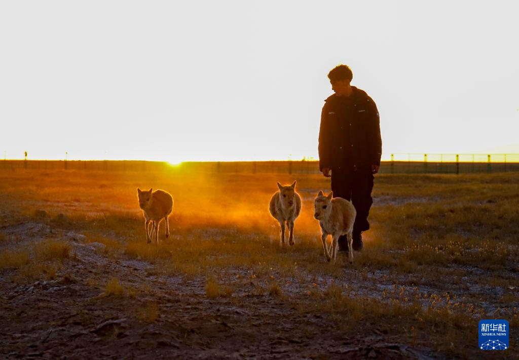 2025年8月27日拍摄的羌塘国家级自然保护区那曲地区管理局尼玛县玛依管护站野生动物专业管护队员罗布与站里收养的藏羚羊幼崽。